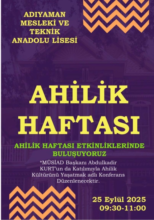 Ahilik Kültürü Haftası etkinliklerinde Adıyaman MÜSİAD Başkanı Abdülkadir KURT öğrencilerimize Ahilik kültürü ile ilgili konferans düzenlendi.